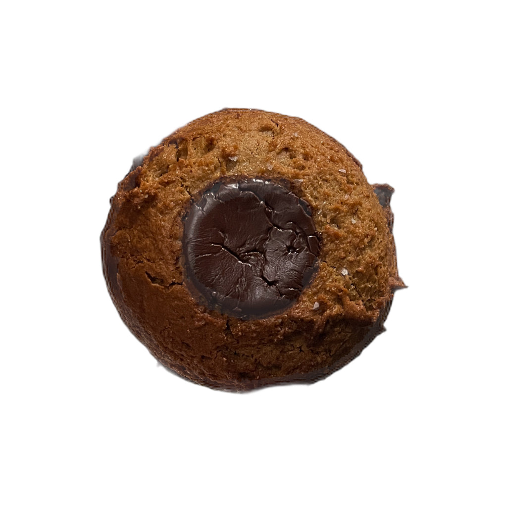Probably the best peanut butter cookie we've ever had. It's a little fudgy in the middle, a little salty on top with some Maldon sea salt, and it's a little chocolatey in the middle with a disc of 70% dark single origin chocolate from Ecuador placed top and center. Gluten free, dairy free, and really really good.