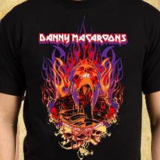 Printed on Next Level 60/40 cotton/poly t-shirts, these are the softest skeleton-in-flames t-shirts you've ever put on. And if you've never put a skeleton-in-flames t-shirt on, this is your chance. The back of the shirt lists the path of sonic destruction caused by the Danny Macaroons 1988 North American Tour.